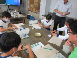 愛知県立芸術大学の阪野先生による特別授業です。先週の「紙を作る」ことに続いて、今回は「絵をかく」ことについての学習です。5・6年生は岩を砕いて作った絵の具を使ったり、自然の植物から抽出した染料を用いたりして、思い思いの絵を描きました。また、洛中洛外図屏風についての学習した後、グループで担当を決め、大きな紙に絵を描きました。本物の芸術にふれた学びの多い授業でした。