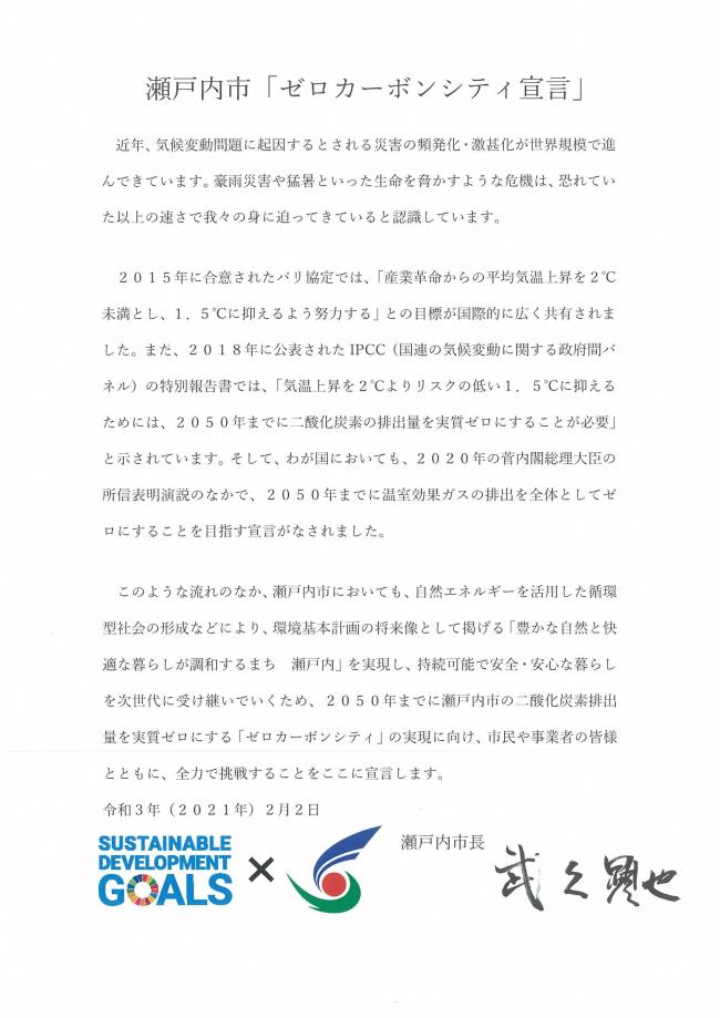 近年、気候変動問題に起因するとされる災害の頻発化・激甚化が世界規模で進んできています。そのような状況下においても、本市が環境基本計画の将来像として掲げる「豊かな自然と快適な暮らしが調和するまち瀬戸内」を実現し、持続可能で安全・安心な暮らしを次世代に受け継いでいくためには、市民の皆様、事業者の皆様との協働が欠かせません。その協働の推進する礎として、本市は令和3年2月2日、2050年までに瀬戸内市の二酸化炭素排出量を実質ゼロにする「ゼロカーボンシティ宣言」を行いました。