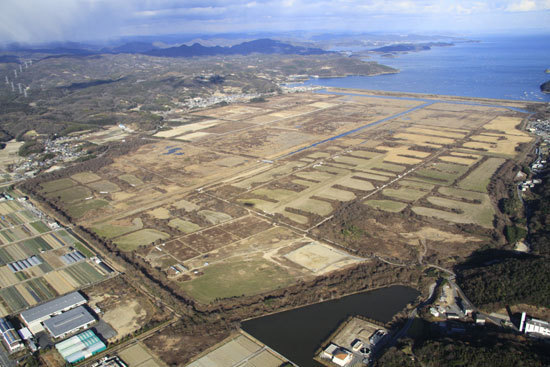 東は錦海湾を仕切る堤防、西は旧安田堤防に区切られ、南北は東西に伸びるなだらかな丘陵地に囲まれた、面積約500ヘクタール(東京ディズニーランド約10個分の広さに相当)の区域です。かつて東洋一といわれた規模の塩田の跡地です。