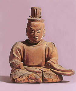 烏帽子をかむり、身に袍を着けて座す木造の俗体官人形です。左肩から上下膊にかけて一材、さらに横に張る袂を一材、それぞれ別矧にしています。頭部は袍の襟首で体部に横矧で着けています。本像の面相に眉根を寄せた怒りが表れています。像は南北朝時代の作と考えられています。